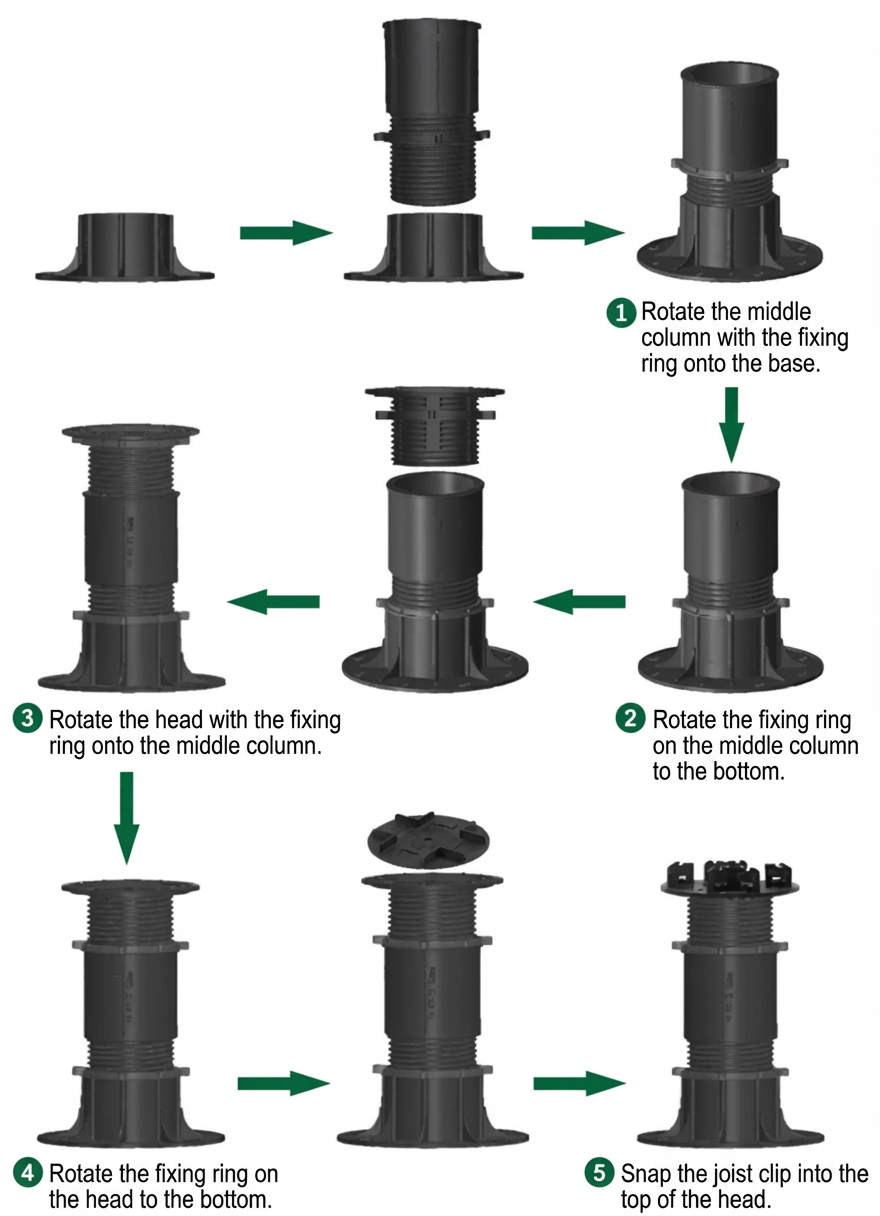 The Trumshi CX00 Series Pedestal for Joist is assembled on site from five modular components in a straightforward 5-step process. No tools are required – all connections use threaded rotation or snap-fit mechanisms.